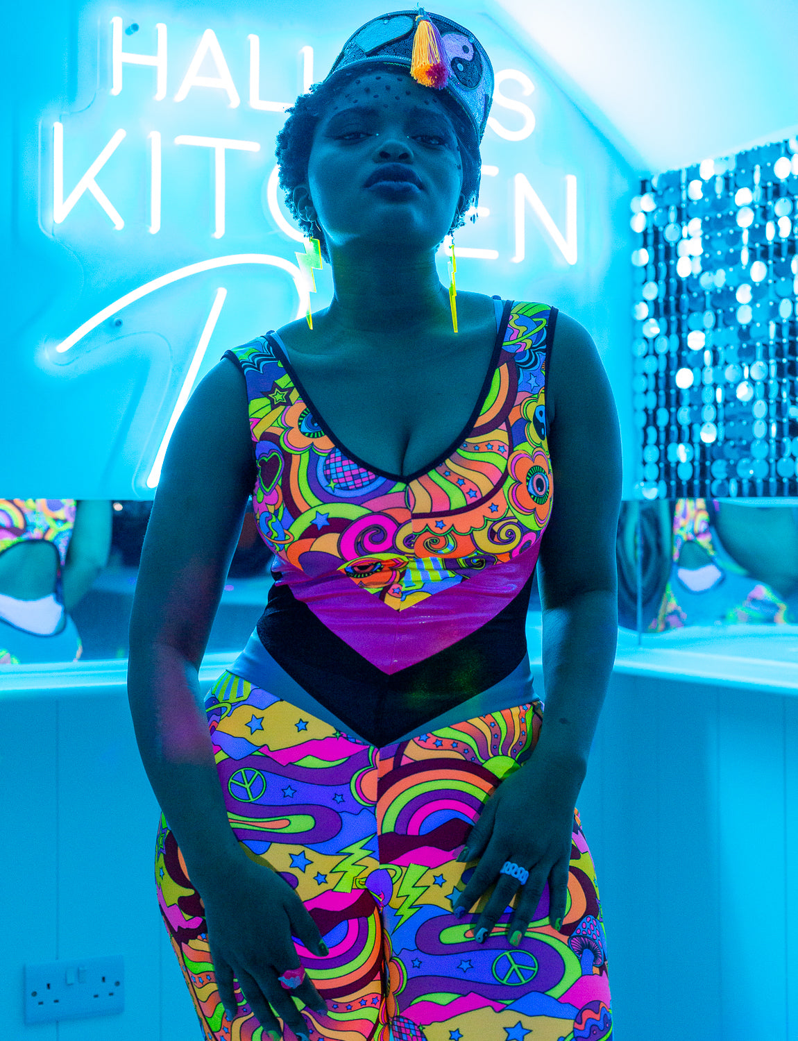 Let your wildest psychedelic dreams run riot in this UV-reactive catsuit. This trippy print is an exclusive collaboration with Dazzle and Jolt, printed on sustainable fabric made with regenerated plastic waste.