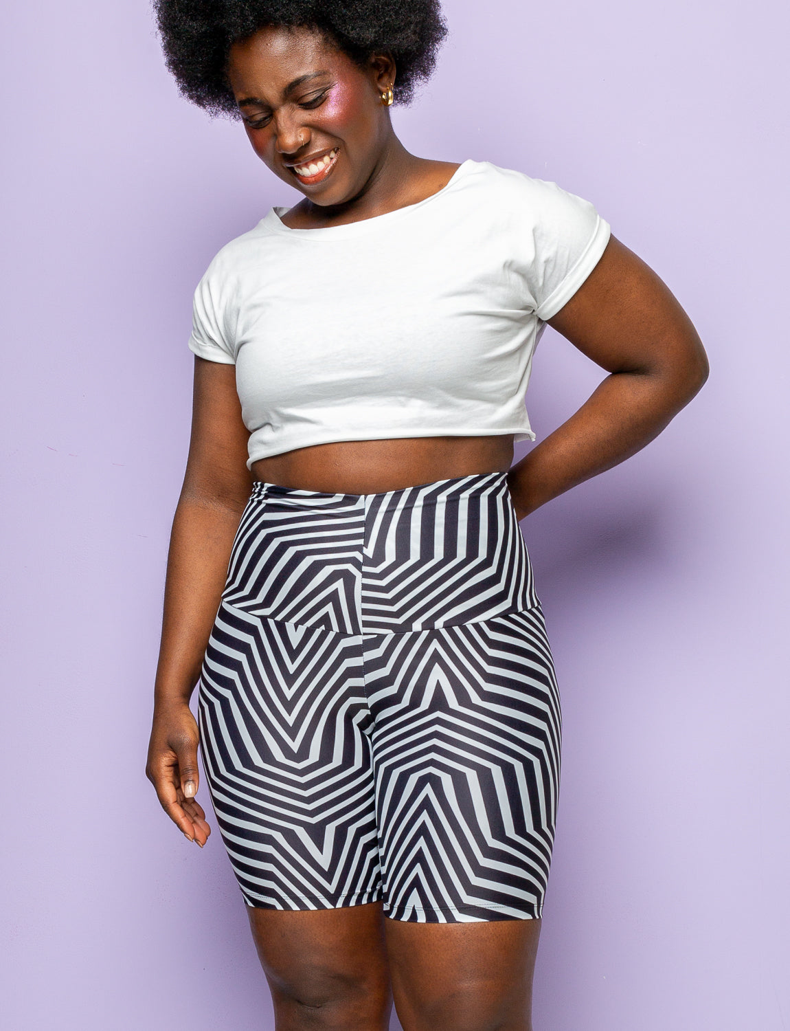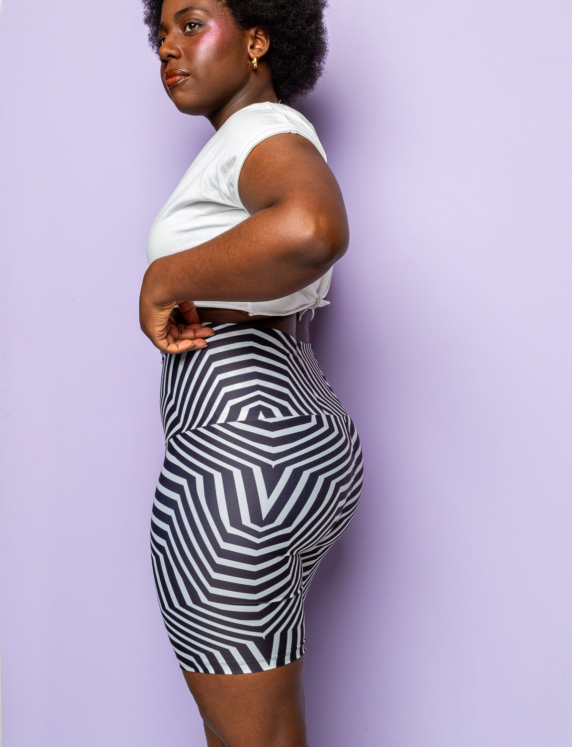 With a hypnotic black and white psychedelic stripe print, these women's Twisted high waist cycling shorts are a trip down the rabbit hole of style. Whether you're hitting the dance floor or a festival field, or simply adding a twist to your everyday look, these shorts are your ticket to a whirlwind of fun. Let your legs do the talking as you strut and spin, in these mesmerising shorts that are as comfy as they are captivating.