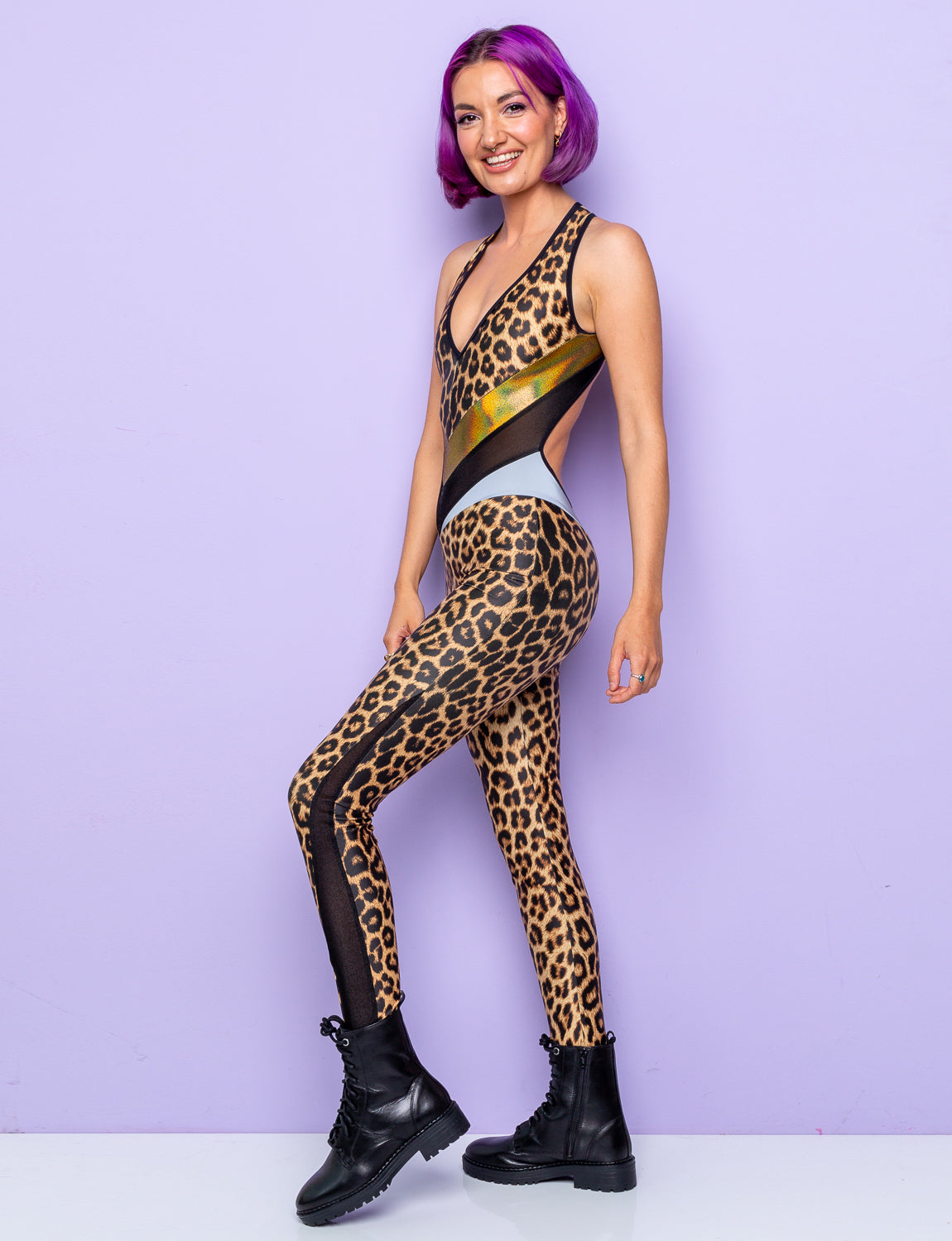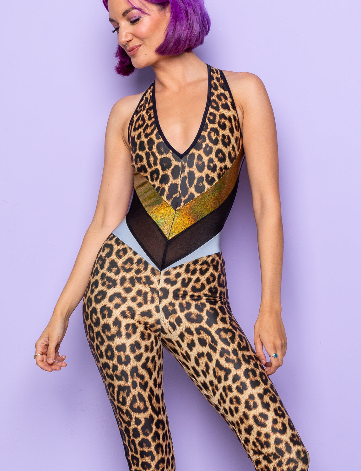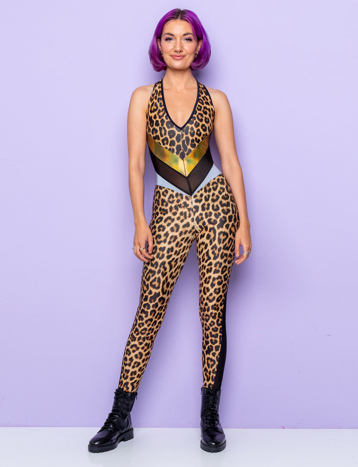 This is one of our top go-to catsuits, created from our time-honoured leopard print on eco-friendly Lycra. It features gold holographic foil and black glitter mist panels to accentuate your curves; this diva can be dressed up or down with ease.