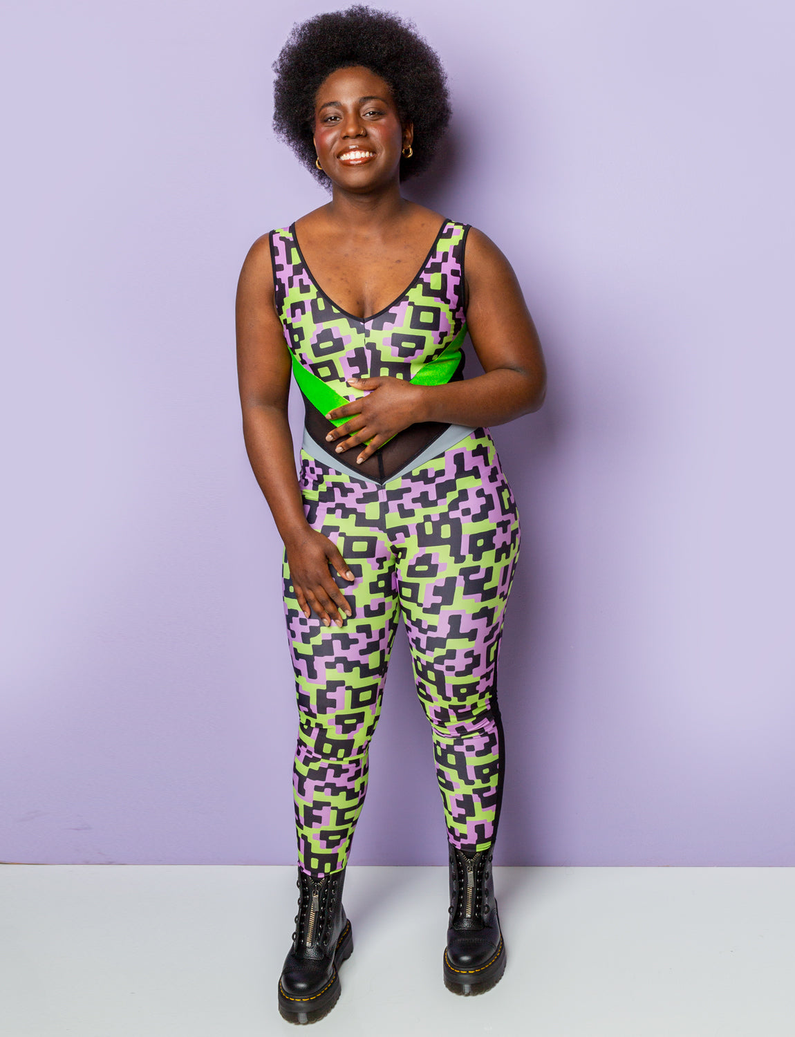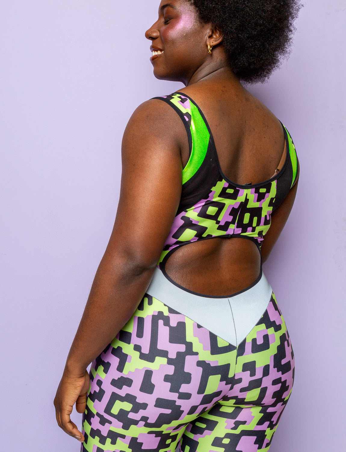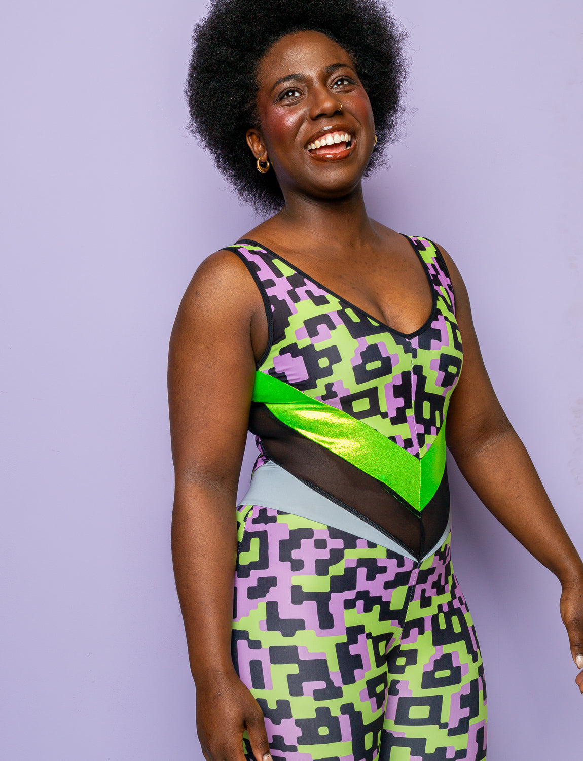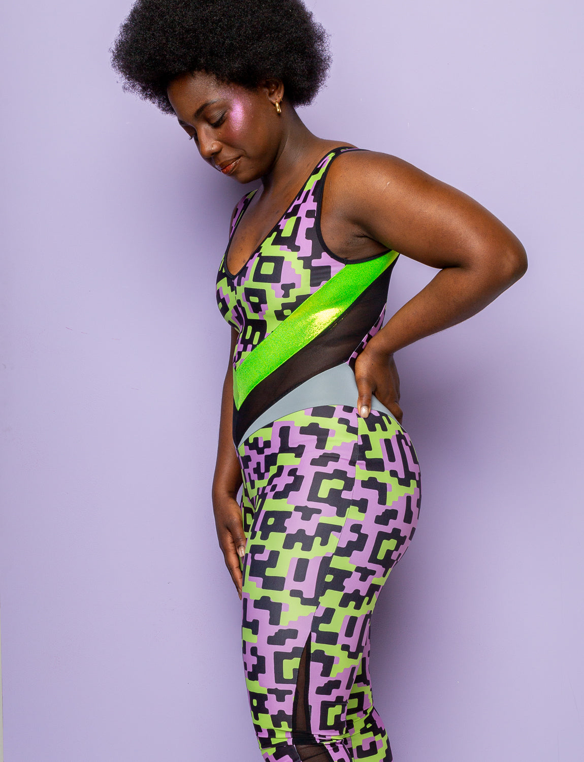 Get ready to turn heads in this women's purple and lime Gizmo peekaboo catsuit. Featuring a vibrant purple and lime colour palette with glittering lime green panels and our signature reflective hip panels ensuring you shine bright like a diamond under any disco ball or stage light. Whether you're hitting the dance floor, owning the stage at a festival, or just unleashing your inner diva on a night out this catsuit will make you feel like the queen of the scene, letting yourself be swept away in a whirlwind of colour and confidence!